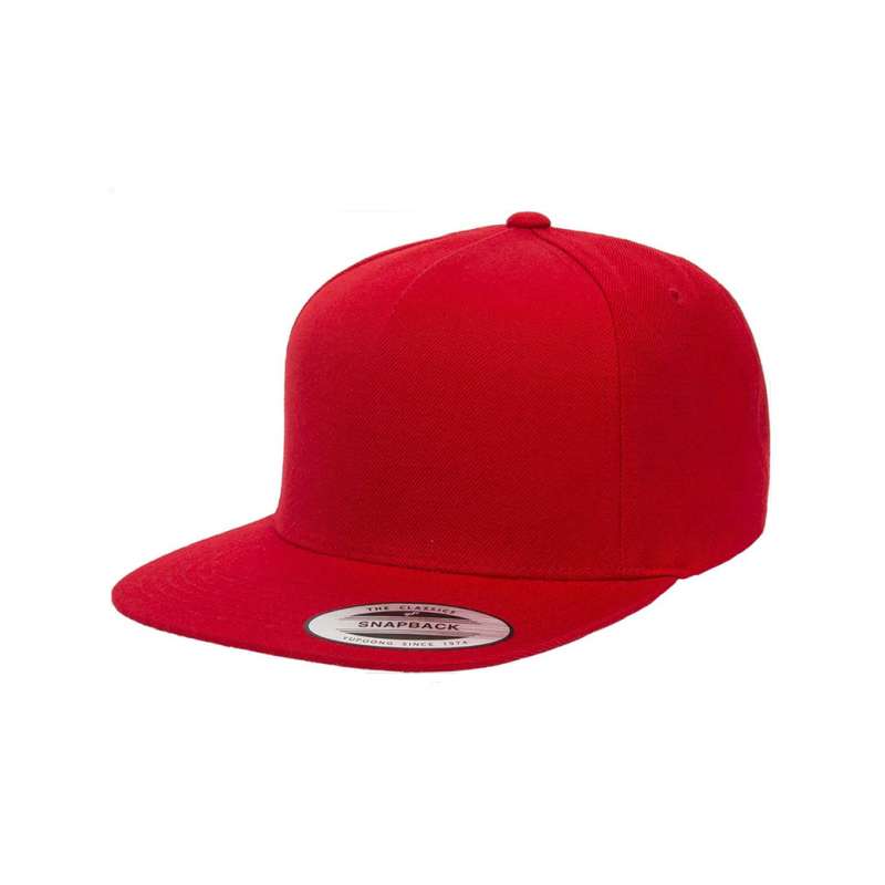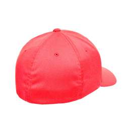 Flexfitkeps röd: 5 paneler, böjd skärm med grå underskärm och resår.